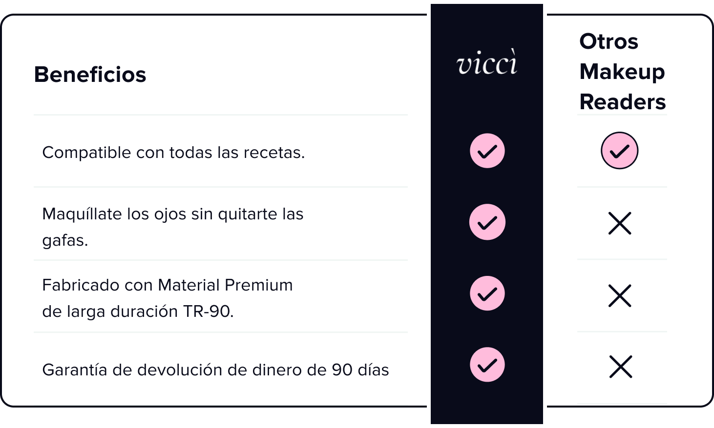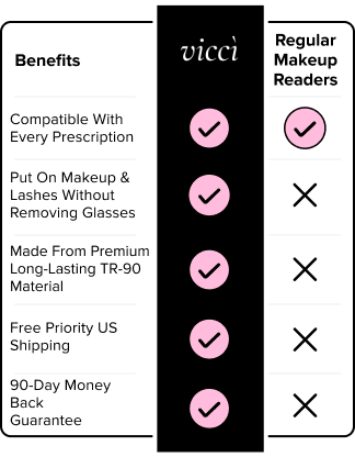 Tus lentes de lectura Vicci™ Makeup están fabricados con materiales duraderos y de alta calidad. ¡Úsalos hasta que los pierdas! 😉